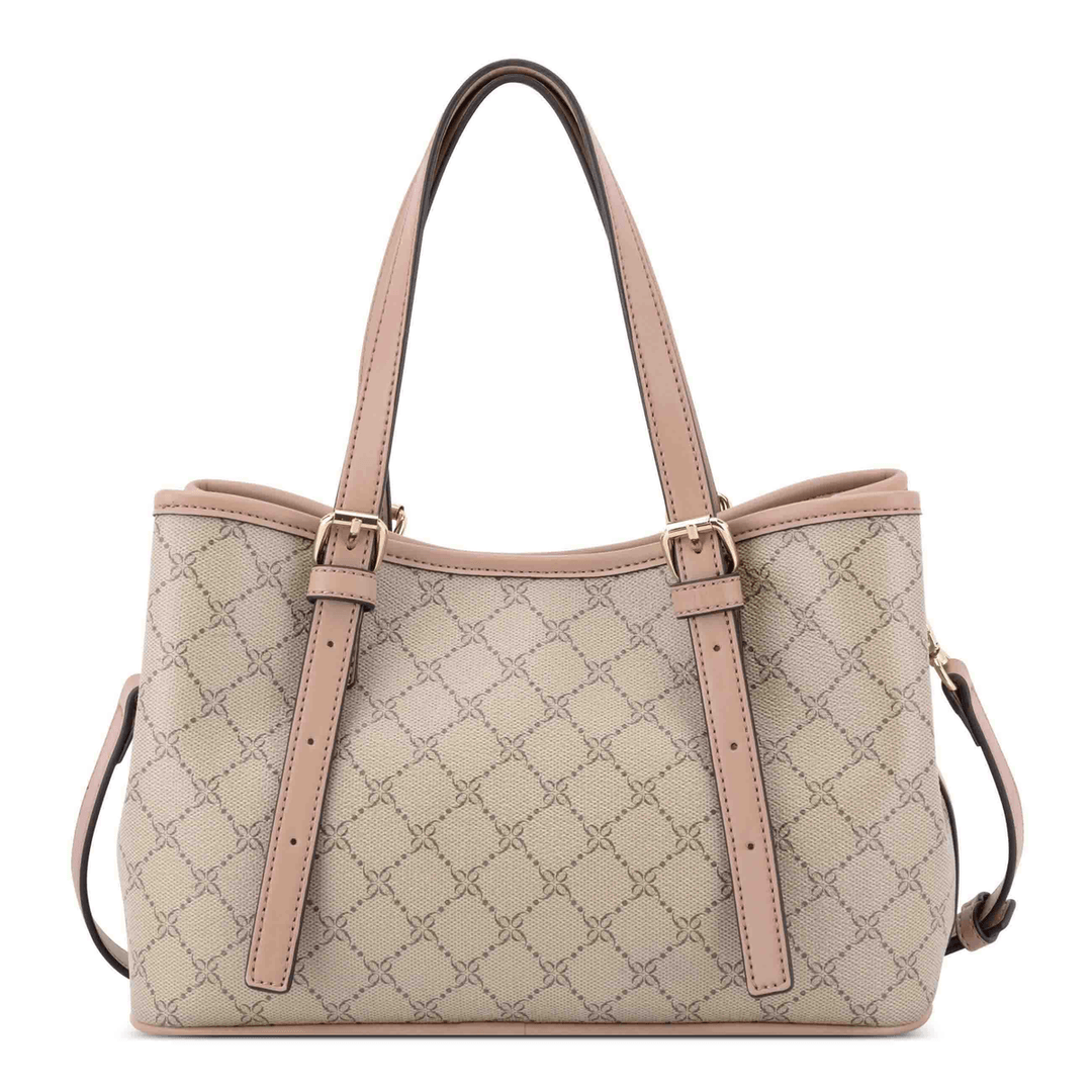 Discover the Nine West Anders Satchel Beige Logo Blushing