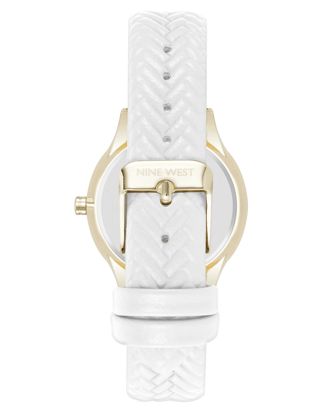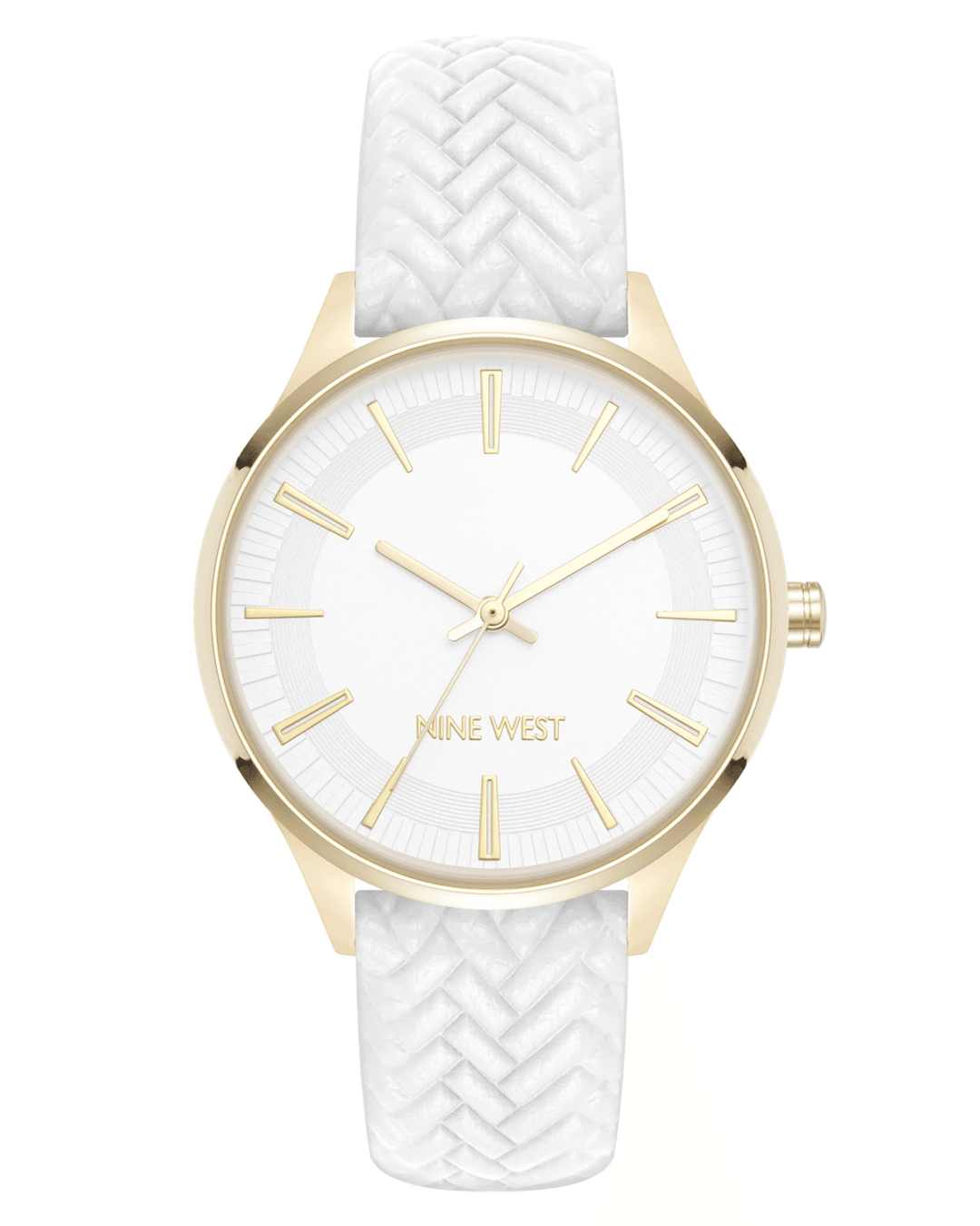 Don’t miss out on this chic accessory. Enhance your collection with the Nine West Chevron Pattern Strap Watch White/Gold today and make every moment count!