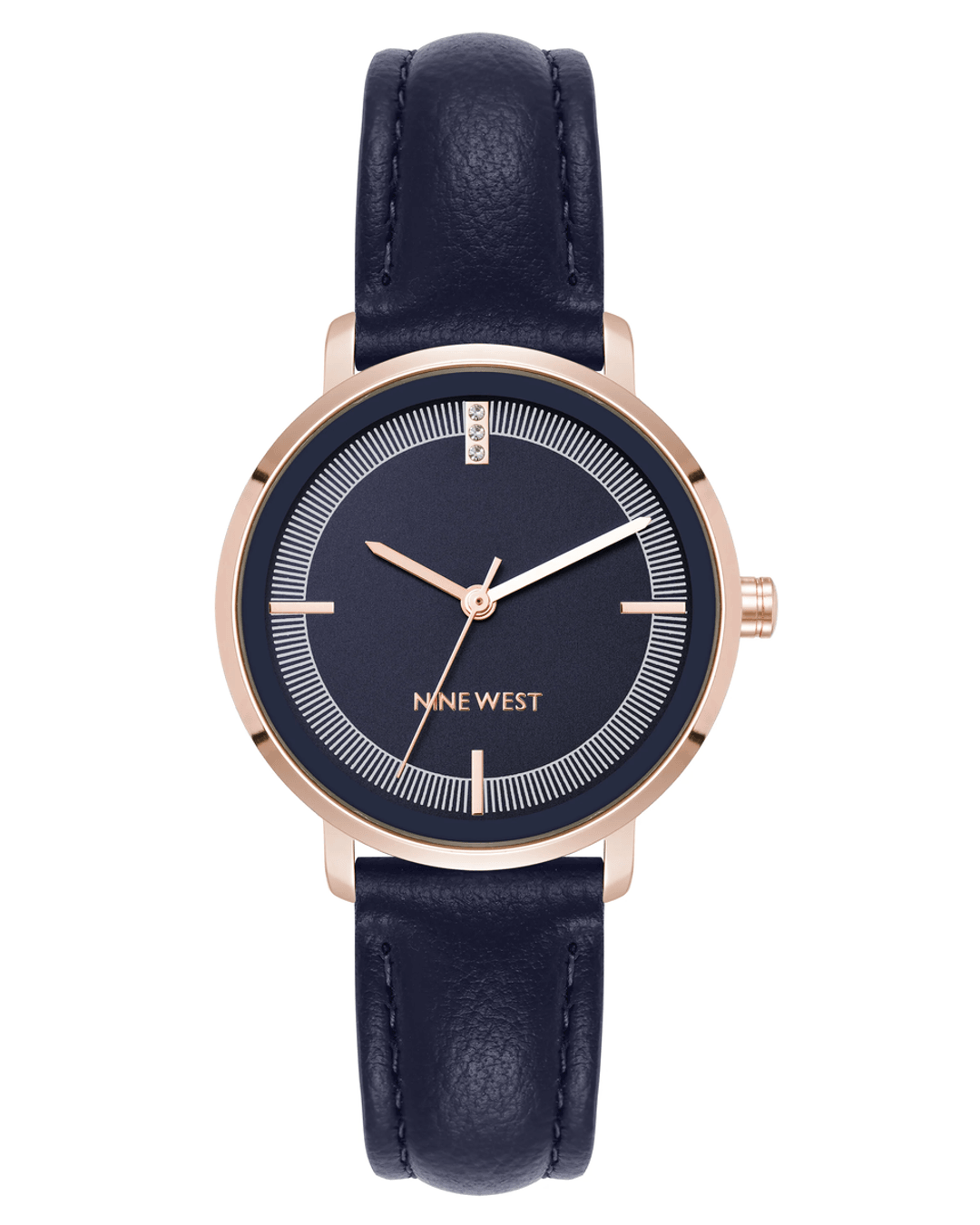 Discover the Elegance of the Nine West Crystal Accented Dial Strap Watch Navy/Rose Gold
