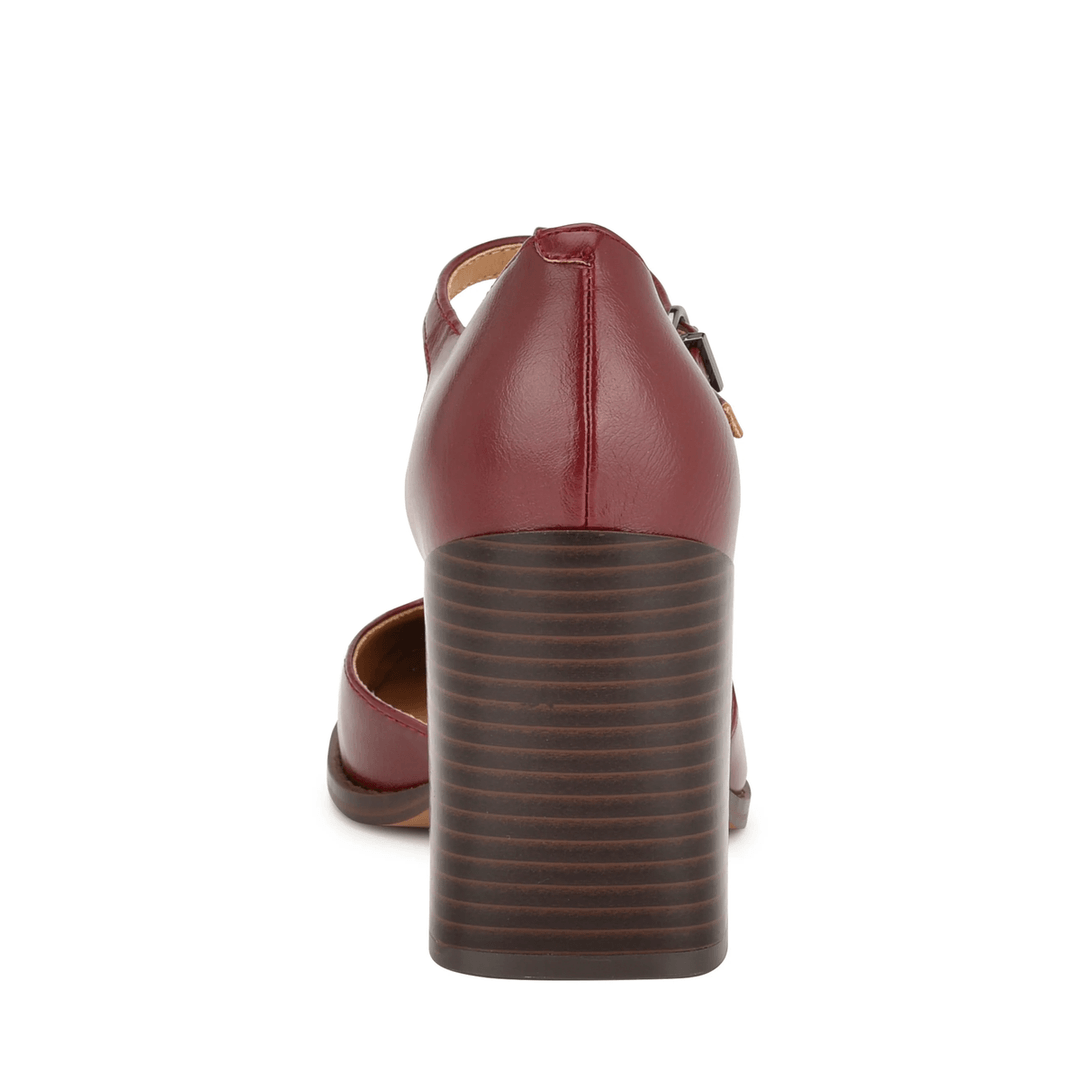 Elevate your footwear collection with the Nine West Janky T Strap Heels in Dark Red. These stunning dress pumps are designed to make a statement, combining fashion-forward elements with everyday comfort.