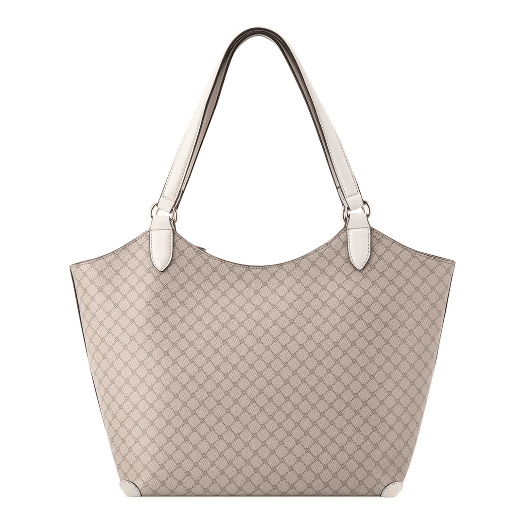 The Nine West Joani Tote Beige Logo Milk is designed for the modern woman on the go. Whether you're heading to the office, a weekend getaway, or a shopping spree, this tote meets all your needs. Its sleek silhouette pairs well with any outfit, making it a versatile addition to your collection.