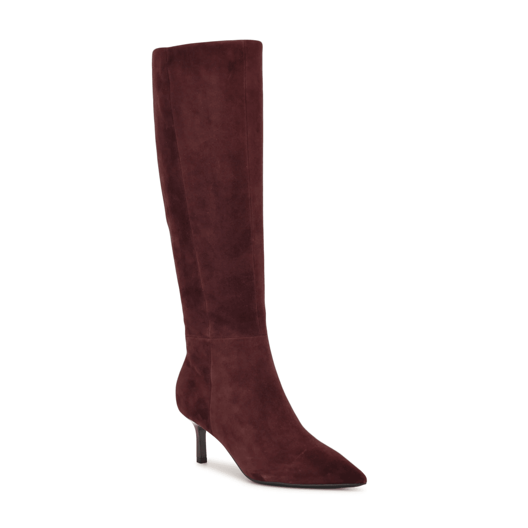 Elevate your style with the Nine West Kimdee 9X9 Knee High Leather Boots in stunning dark red suede. These chic dress boots are designed to enhance any outfit, making them a must-have addition to your wardrobe.