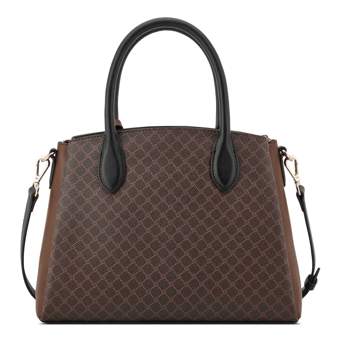 Discover the Nine West Mary Satchel in Brown and Black Logo