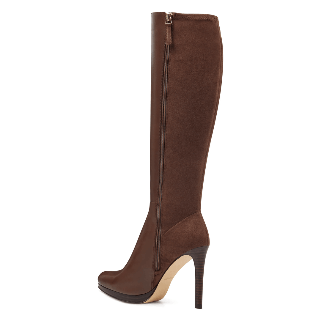 Step up your fashion game with the Nine West Quizme Platform Leather Boots in rich brown leather and suede. Featuring a stunning 4-inch heel, these boots not only add height but also enhance your natural silhouette with an elegant almond-toe design.