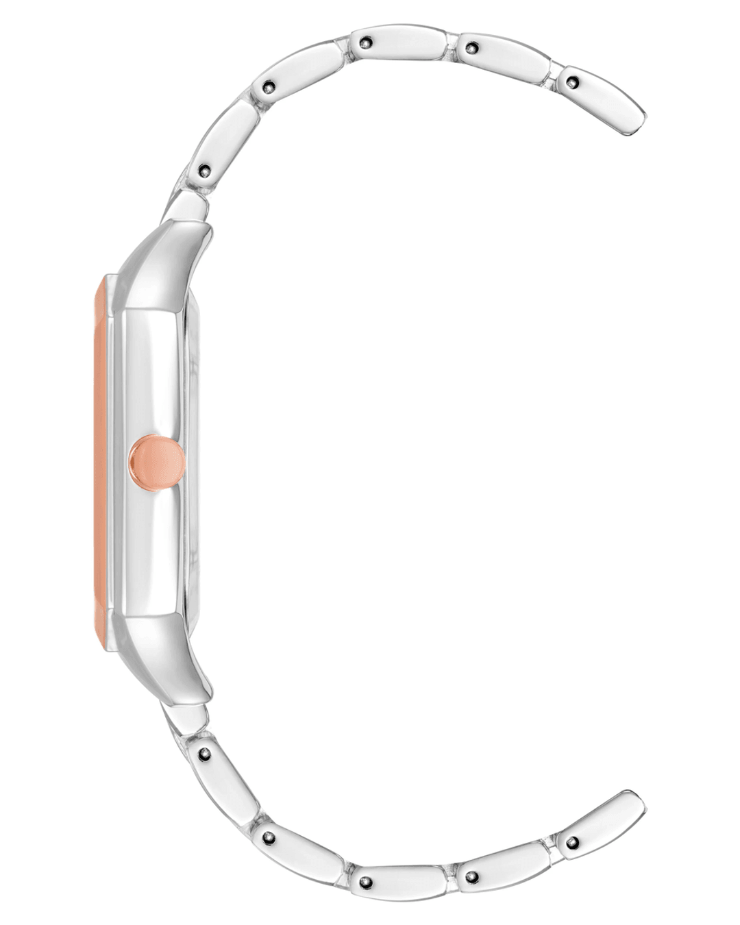 The Nine West Rectangular Case Bracelet Watch Silver/Rose Gold is more than just a timekeeper; it's a statement piece that enhances your overall look. The radiant mineral crystal lens protects the elegant face, ensuring durability and clarity. With its adjustable link bracelet, you can find the perfect fit, making it suitable for any wrist size.