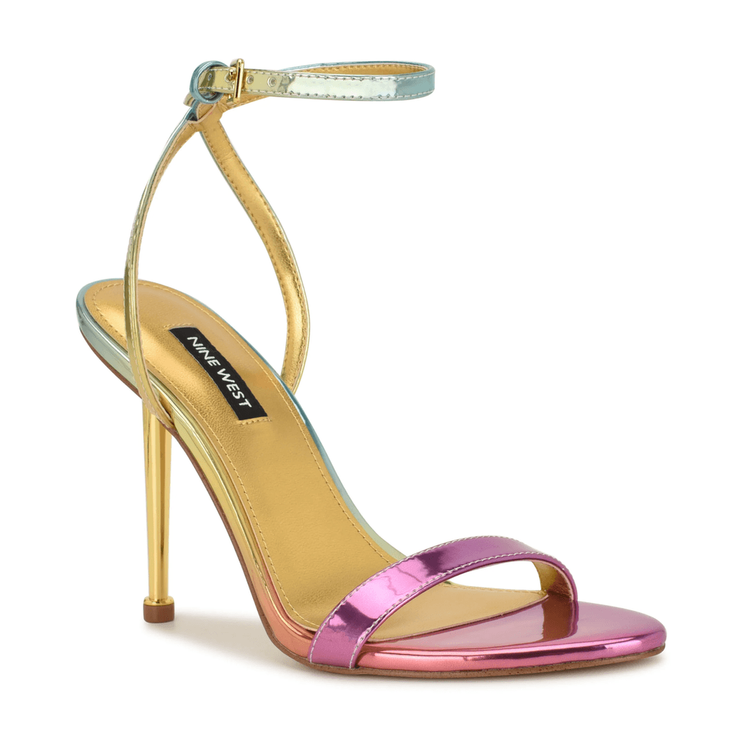 The Nine West Reina Ankle Strap Sandals Rainbow Metallic showcase a beautiful metallic finish that adds a pop of color to any outfit. With a chic skinny high heel, these sandals provide just the right amount of elevation without sacrificing comfort. Pair them with a flowy dress or your favorite jeans for a look that turns heads.