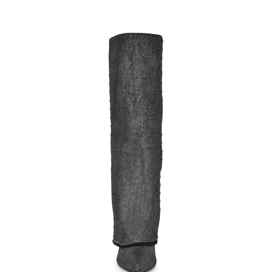 Elevate your fashion game with the Nine West Rhoree Knee High Dress Boots. These stunning silver metallic denim boots are designed to make a statement, featuring a chic pointy toe and a sleek stiletto heel. Perfect for any occasion, the Rhoree boots will undoubtedly turn heads wherever you go.